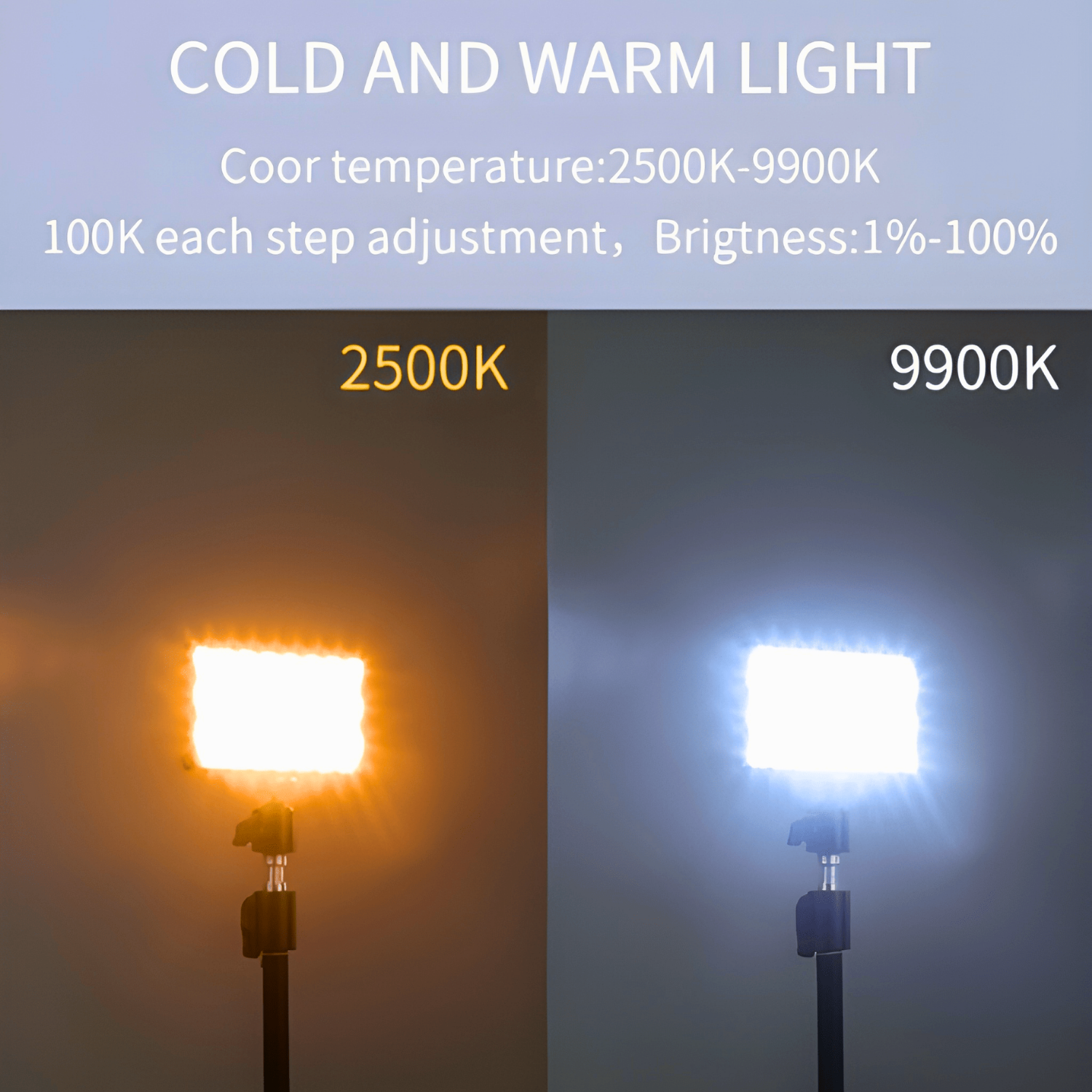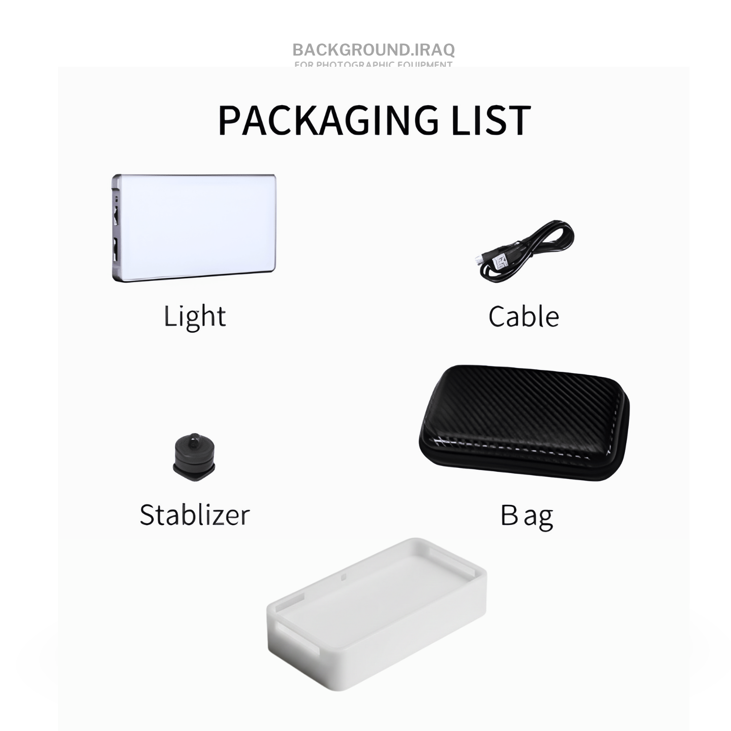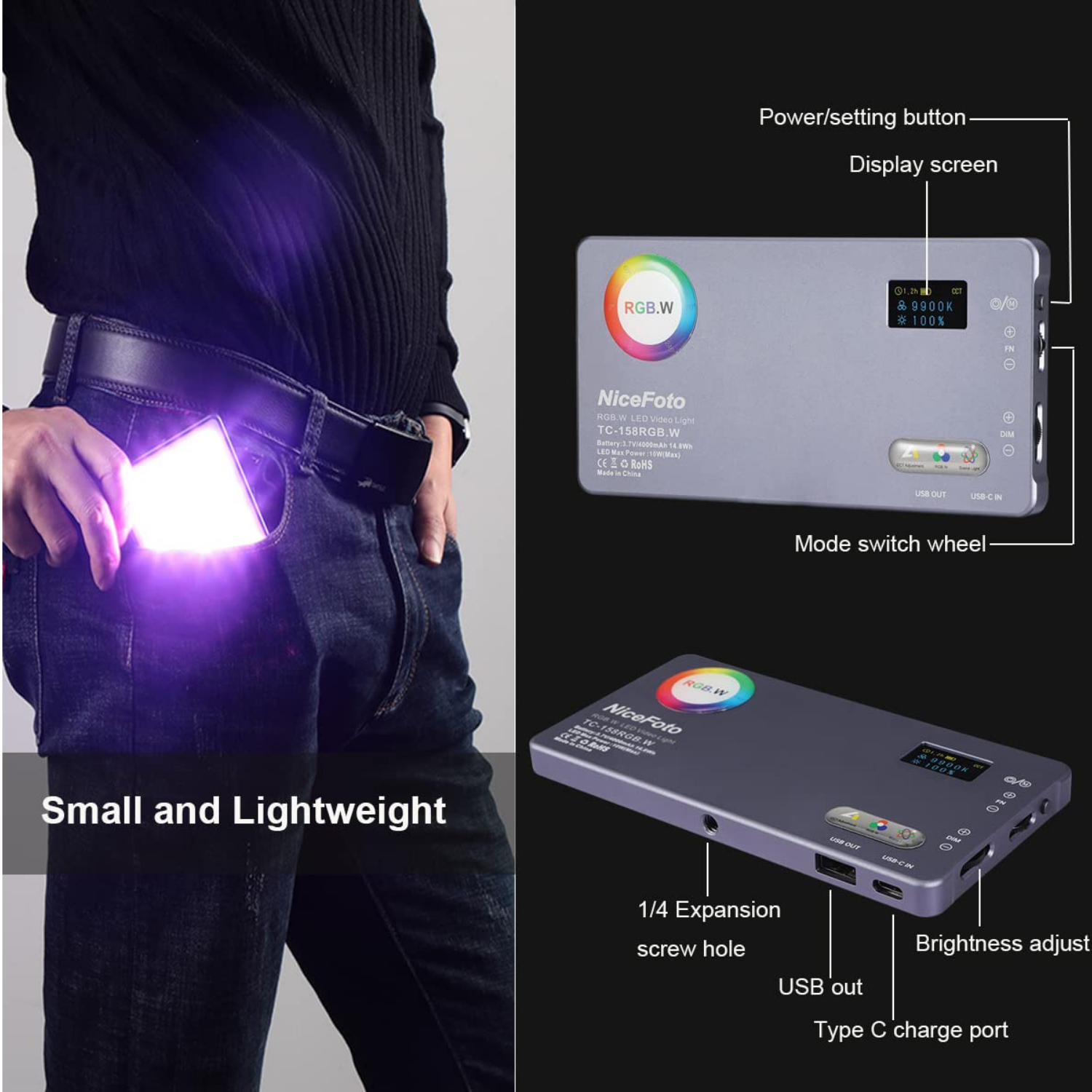 إضاءة NiceFoto TC-158RGB.W 10W هي ضوء LED محمول يقدم ألوان RGB كاملة + Bi-Color مع تصميم صغير وخفيف، مناسب للتصوير بالكاميرا أو الموبايل. يوفر تحكم دقيق بالألوان والإضاءة مع بطارية مدمجة، مما يجعله خيار ممتاز لصناع المحتوى والتصوير المتنقل. 🔧 أبرز المواصفات القدرة: 10W LED درجة حرارة اللون: 2500K – 9900K (دافئ إلى بارد) الألوان: RGB كامل + أكثر من 36,000 لون شدة الإضاءة: حتى 1000 لومن دقة الألوان: CRI ≥ 95 TLCI ≥ 95 السطوع: قابل للتعديل من 0% إلى 100% المؤثرات: 21 تأثير إضاءة FX (شرطة، برق، تلفزيون…) زاوية الإضاءة: حوالي 120° 🔋 البطارية والتصميم بطارية مدمجة: 4000mAh مدة التشغيل: تقريبًا 1.5 – 2 ساعة على أقصى سطوع الشحن: USB / Type-C الوزن: حوالي 250–360 غرام (خفيف جدًا) التثبيت: Hot Shoe للكاميرا مدخل 1/4 للستاند أو الترايبود 🎛️ المميزات الأساسية RGB كامل + تحكم HSI دقيق حجم صغير مناسب للجيمبال أو الكاميرا بطارية داخلية (ما تحتاج كهرباء) مثالي للتصوير المتنقل سهل الاستخدام للمبتدئين