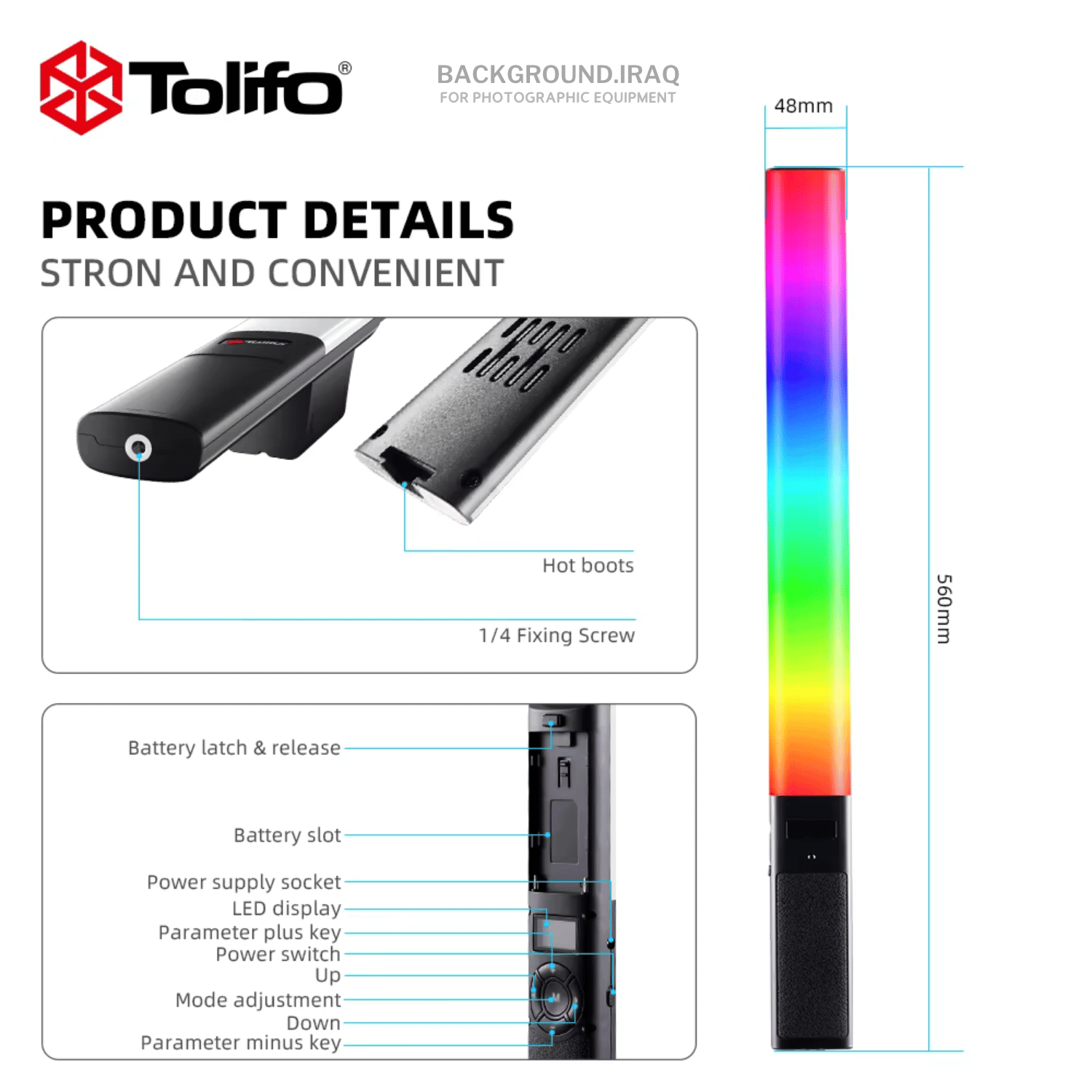 هو ضوء LED محمول (Stick Light) صغير وخفيف، يوفر إضاءة ملونة وإبداعية، مناسب لصناع المحتوى والتصوير اليومي. ⭐ أهم المميزات: 🌈 RGB كامل + Bi-Color تحكم كامل بالألوان (Hue / Saturation) 💡 قدرة 20W مناسبة كإضاءة خفيفة أو تأثيرية 🌡️ حرارة لون 3000K – 6000K إضاءة دافئة وبيضاء 🎚️ تعتيم 10% – 100% تحكم كامل بشدة الإضاءة 🎨 CRI عالي (≈98) ألوان دقيقة واحترافية 🎬 13 تأثير إضاءة (FX) مثل البرق والنار وTV 🎯 Barndoors للتحكم باتجاه الضوء 📱 تحكم عبر ريموت حتى ~8 متر 🔋 بطارية + تشغيل خارجي مناسب للتصوير الخارجي ⚙️ المواصفات: القدرة: 20 واط شدة الإضاءة: حوالي 2400 لومن عدد LEDs: White + RGB عمر التشغيل: حتى 50,000 ساعة الوزن: حوالي 0.5–0.6 كغم الطول: حوالي 56 سم 🎬 الاستخدام: مثالي لـ: تصوير Vlog السوشيال ميديا إضاءة RGB خلفية تصوير المنتجات السفر والتصوير السريع ✅ الخلاصة: 👉 ضوء صغير جدًا وخفيف وسهل الاستخدام 👉 ممتاز كإضاءة تأثيرات أو إضاءة ثانوية 👉 مو مناسب كإضاءة رئيسية بسبب قوته المحدودة