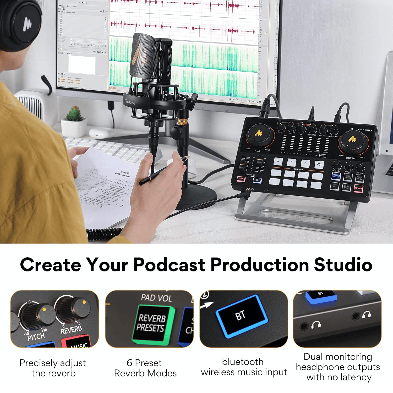 هو مكسر صوت احترافي مصمم للبث المباشر، البودكاست، الألعاب، وصناعة المحتوى. يدعم توصيل المايكات عن طريق XLR أو 6.35mm، بالإضافة إلى الاتصال المباشر بالكمبيوتر عبر USB-C، لذلك يعتبر خيار مناسب للمبتدئين وصناع المحتوى الذين يريدون تحكم أفضل بالصوت بدون إعدادات معقدة. ([Maono][1]) تفاصيل مختصرة: * يدعم مايكات Dynamic وCondenser * يحتوي على 48V Phantom Power * قوة Preamp تصل إلى 60dB * يدعم Bluetooth 4.2 لتشغيل الموسيقى أو الصوت من الهاتف * يحتوي على 3 أزرار Sound Pads قابلة للتخصيص * يحتوي على 6 مؤثرات Reverb و4 Voice Changers * يدعم Noise Reduction بمستويين * يحتوي على منفذ AUX ومنفذ Headphone للمراقبة المباشرة * يدعم Stream Out للتوصيل المباشر مع الهاتف * جودة تسجيل 48kHz / 16bit * بطارية داخلية 2000mAh * مدة تشغيل تصل إلى حوالي 8 ساعات * الشحن عبر USB-C * حجم صغير ومناسب للتنقل والاستخدام الخارجي ([Maono][1]) الميزة الأساسية به أنه يجمع بين مكسر صوت، كرت صوت، ومؤثرات صوتية داخل جهاز واحد، لذلك إذا عندك مايك مثل MAONO PD200XS أو أي مايك XLR فراح تستفيد من قوة الـ Preamp والـ Phantom Power الموجودة به. كذلك كثير من المستخدمين يمدحون حجمه الصغير وسهولة الاستخدام خصوصاً للبث والبودكاست.