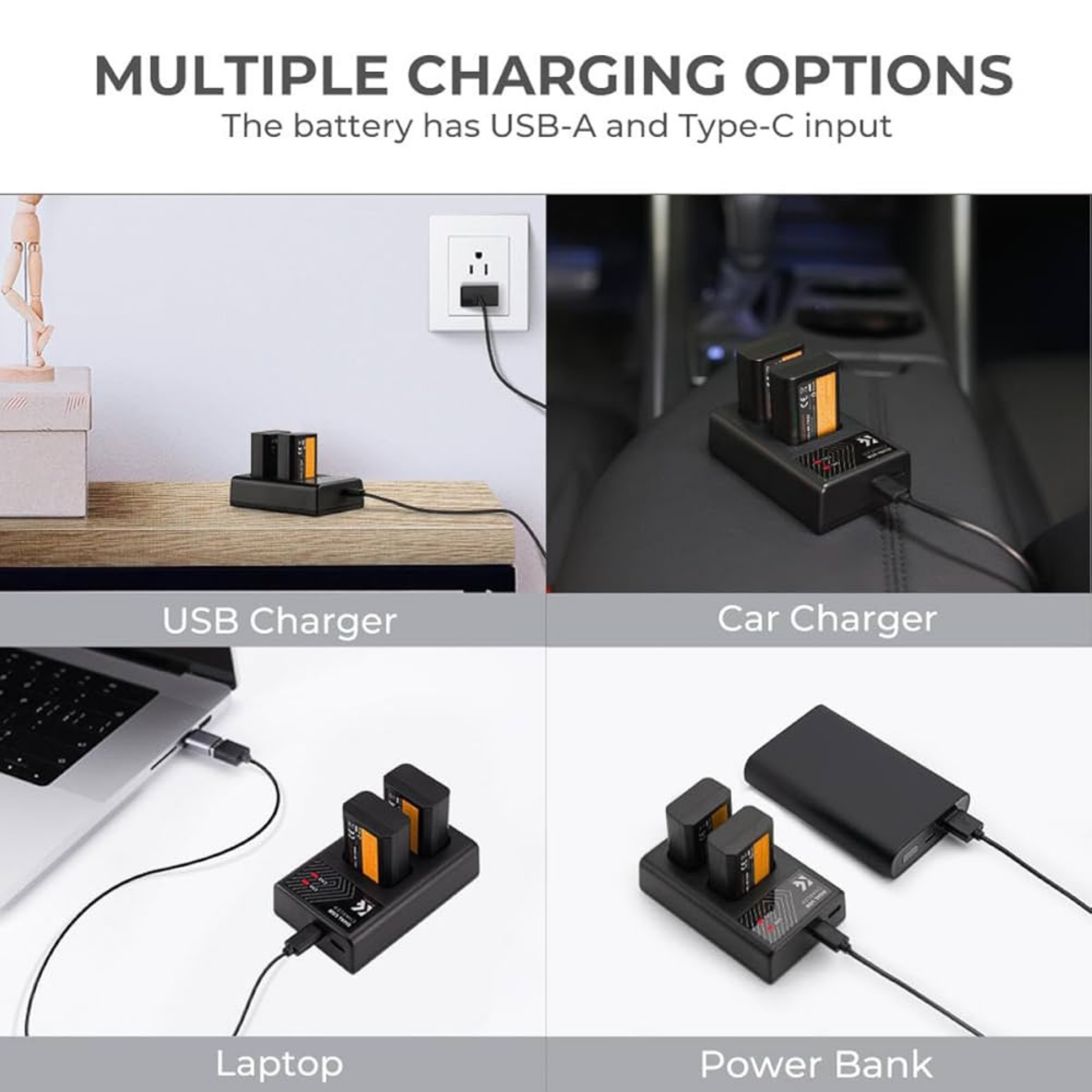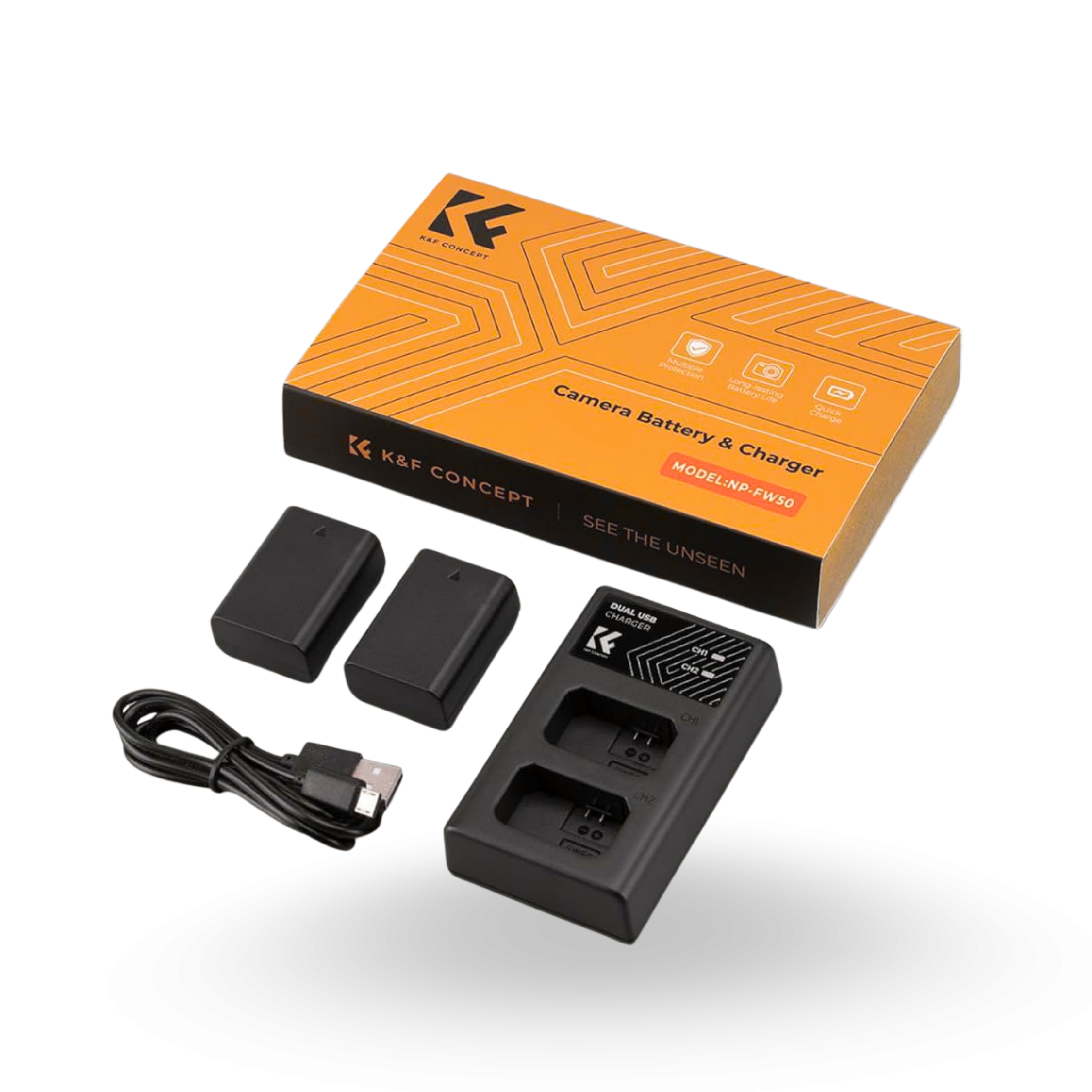 طقم K&F Concept NP‑FW50 2 Pack Replacement Batteries and Dual Slot Charger (KF28.0015) يتضمن بطاريتين بديلتين NP‑FW50 بسعة 1100 mAh لكلٍ منهما وشاحن ثنائي‑الفتحات بمدخلين (Micro‑USB وUSB‑C) لشحن بطاريتين في نفس الوقت أو منفصلًا من أي مصدر USB (مثل شاحن جداري، باور بانك، كمبيوتر). البطاريات متوافقة 100 % مع بطاريات Sony NP‑FW50 المستخدمة في كاميرات Sony Alpha وNEX وسلسلة ZV‑E10 وغيرها، وتوفر وقت تشغيل أطول للتصوير الفوتوغرافي والفيديو خارج الاستديو.