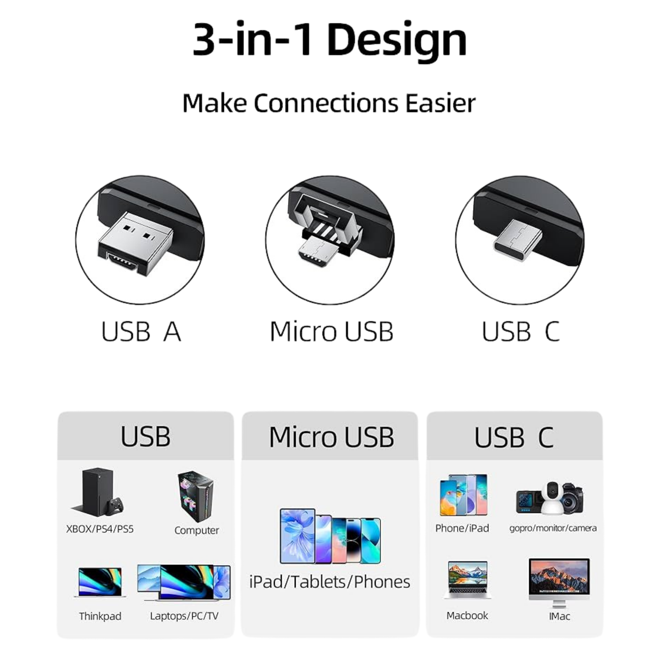 Go Des GD-DK108 3 in 1 OTG هو قارئ كروت ذاكرة متعدد المنافذ مصمم لتوصيل كروت الذاكرة أو الفلاش ميموري بالهاتف أو الكمبيوتر بسهولة. يتميز بتصميم صغير وخفيف ويعمل بتقنية OTG لنقل البيانات بسرعة بين الأجهزة المختلفة.