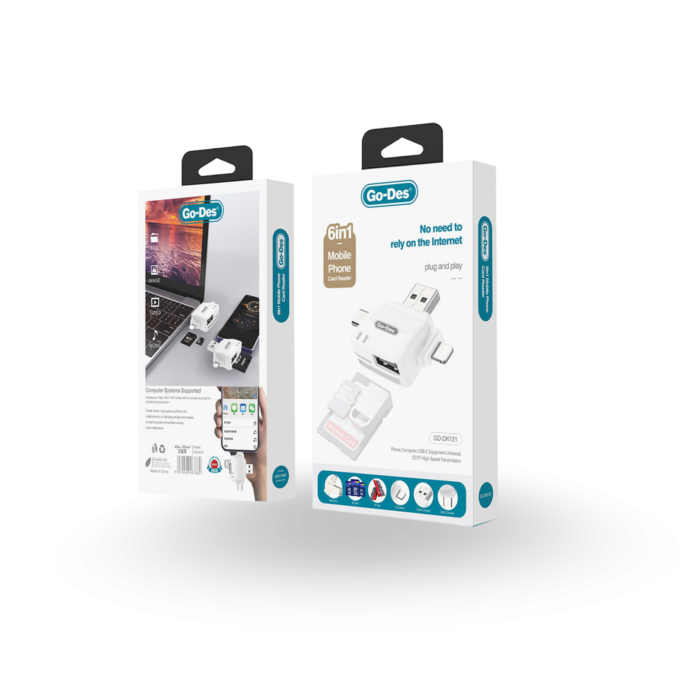 Go Des GD-DK121 هو قارئ كروت ذاكرة متعدد الوظائف 6 في 1 يتيح نقل البيانات بسهولة بين الهاتف والكمبيوتر وبطاقات الذاكرة. يتميز بتعدد المنافذ ودعم تقنية OTG لتوصيل الأجهزة مباشرة دون الحاجة إلى برامج إضافية.