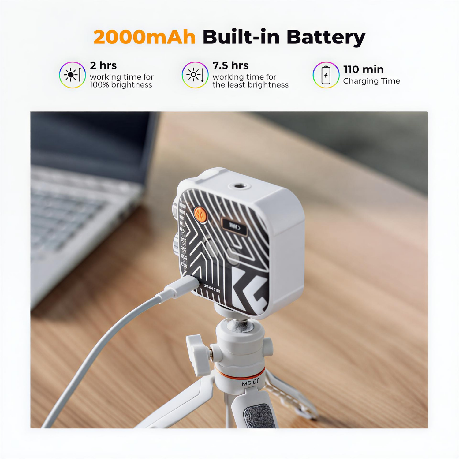 هو ضوء LED محمول للتصوير الفوتوغرافي والفيديو، أقوى قليلاً وأكثر احترافية من بعض الموديلات الصغيرة، ويستخدم كثيراً في الفلوقات والبث المباشر وتصوير المنتجات. المواصفات الرئيسية • 💡 القدرة: 6 واط • 🔆 عدد مصابيح LED: 60 لمبة (20 أبيض + 20 دافئ + 20 RGB) • 🌡 درجة حرارة اللون: من 2500K إلى 9900K • 🎨 وضع RGB كامل: تغيير اللون من 0° إلى 360° • 📊 CRI: حوالي 96+ لدقة ألوان عالية • 🔦 السطوع: يصل إلى 900 لوكس على مسافة 0.5 م • 🔋 البطارية: 2000mAh قابلة للشحن • ⏱ مدة التشغيل: حوالي 2 ساعة تقريباً حسب مستوى السطوع • ⚖ الوزن: حوالي 120 غرام • 📏 الحجم: تقريباً 7.6 × 7 × 3.2 سم