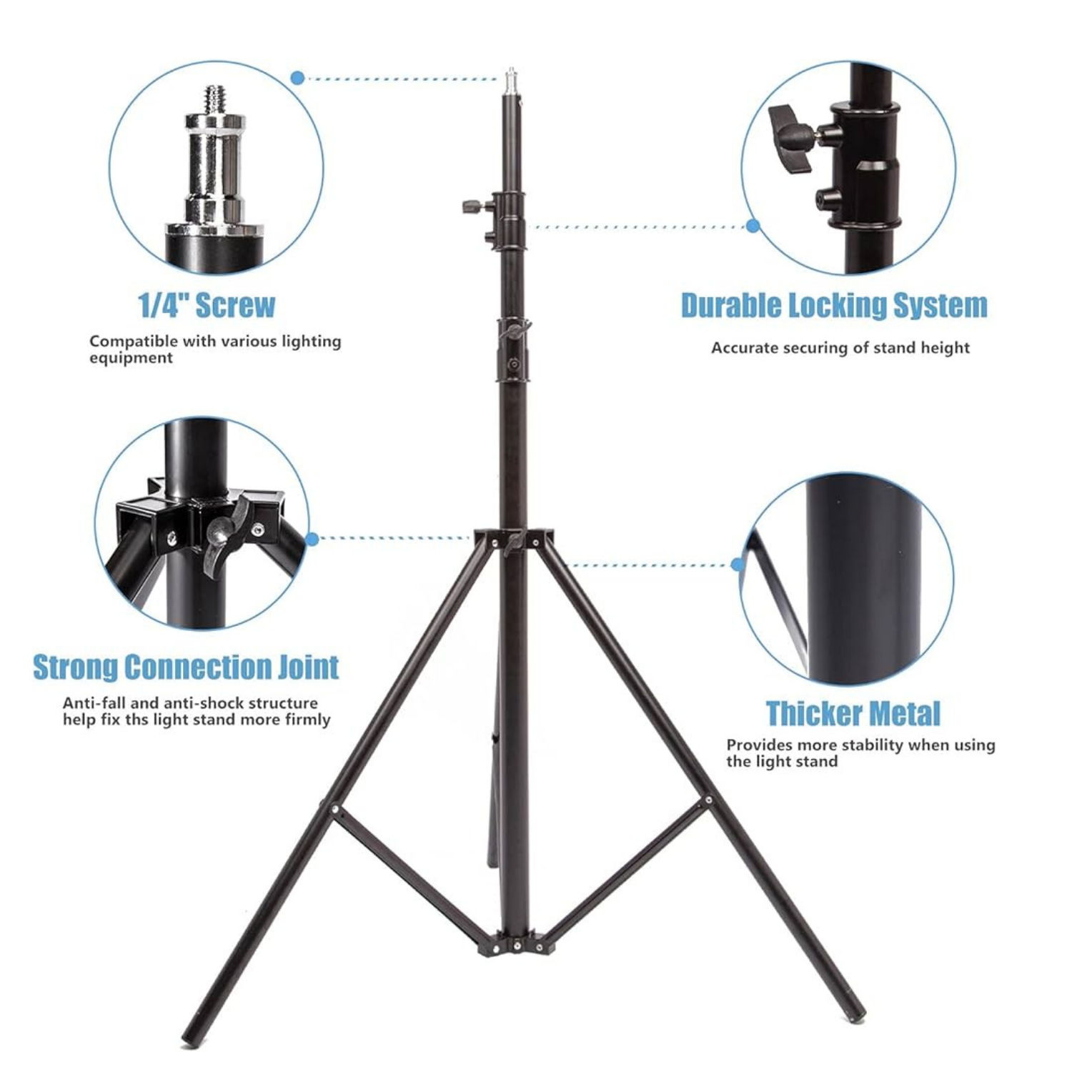 حامل الإضاءة ZSYB STAND 2.8M Metal Light Stand هو ستاند تصوير احترافي ثلاثي الأرجل مصنوع من معدن قوي ومصمم لدعم معدات الإضاءة في الاستوديو أو أثناء التصوير الخارجي. يتميز بارتفاع يصل إلى 2.8 متر مع تصميم ثابت وقابل للطي، ما يجعله مناسبًا لحمل الإضاءات، السوفت بوكس، الفلاشات، والملحقات الخاصة بالتصوير والفيديو. 🔧 أبرز المواصفات النوع: حامل إضاءة ثلاثي (Light Stand). الارتفاع الأقصى: 2.8 متر (حوالي 110 إنش). الارتفاع الأدنى: حوالي 1 متر. الطول عند الطي: حوالي 94–98 سم لسهولة النقل والتخزين. المادة: معدن / ستانلس ستيل قوي لتحمل الاستخدام الطويل. أقصى وزن تحمله: حتى 10–12 كغم من معدات الإضاءة. عدد الأقسام: 3 مراحل لرفع الارتفاع تدريجيًا. رأس التثبيت: مسمار 1/4 و 3/8 إنش متوافق مع أغلب معدات التصوير. التصميم: نظام قفل قوي مع قاعدة ثلاثية ثابتة لمنع الاهتزاز. الوزن: حوالي 2–2.5 كغم تقريبًا.