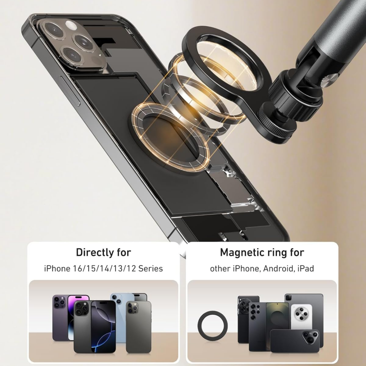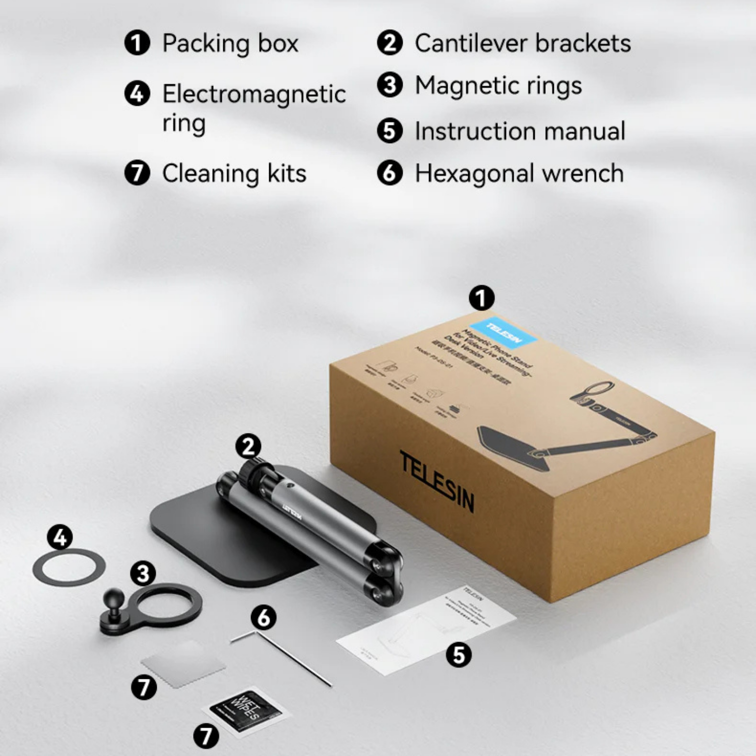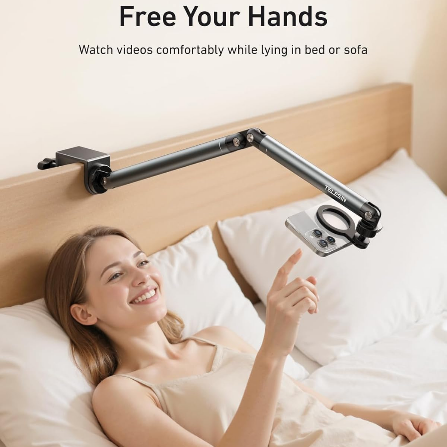 حامل TELESIN Magnetic Phone Holder Clamp هو حامل احترافي يُثبت على الطاولة أو السرير، مزود بذراع قابل للتعديل بزاوية 360° لتوفير تجربة استخدام مريحة بدون استخدام اليدين. يعتمد على مغناطيس قوي (MagSafe) لتثبيت الهاتف بسرعة وأمان، مع تصميم مرن يسمح بالتصوير أو المشاهدة من أي زاوية. المميزات الرئيسية تثبيت مغناطيسي قوي (N52): يثبت الهاتف بسرعة وبيد واحدة. ذراع قابل للتعديل 360°: تحكم كامل بالزوايا (أفقي / عمودي / تصوير علوي). مشبك قوي (Clamp): يثبت على الطاولات أو السرير بدون انزلاق. تصميم مرن وقابل للطي: سهل التخزين والنقل. هيكل متين: مصنوع من الألمنيوم مع سيليكون للحماية والثبات. يقلل من إجهاد الرقبة أثناء المشاهدة أو العمل لفترات طويلة. المواصفات نوع المنتج: حامل هاتف مكتبي/سرير نوع التثبيت: Clamp (مشبك) زاوية الدوران: 360° سماكة التثبيت: حتى 5 سم تقريباً المواد: ألمنيوم سيليكون التحمل: حتى حوالي 1.3 كغم (3 باوند) التوافق: iPhone (MagSafe) جميع الهواتف (مع حلقة مغناطيس) يدعم أيضاً بعض الأجهزة اللوحية (Tablets) الاستخدامات مشاهدة الفيديو أثناء الاستلقاء على السرير بث مباشر (Live Streaming) تصوير من الأعلى (Top View / Overhead) استخدام الهاتف أثناء العمل بدون اليد قراءة أو تصفح بشكل مريح