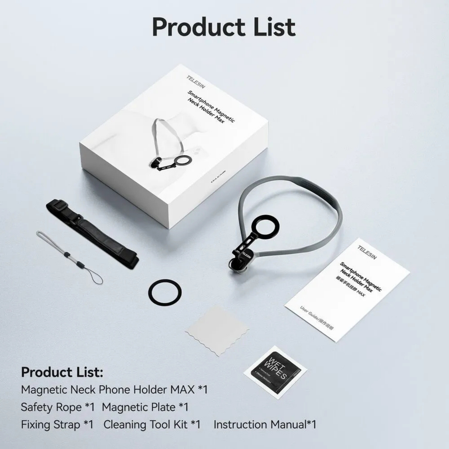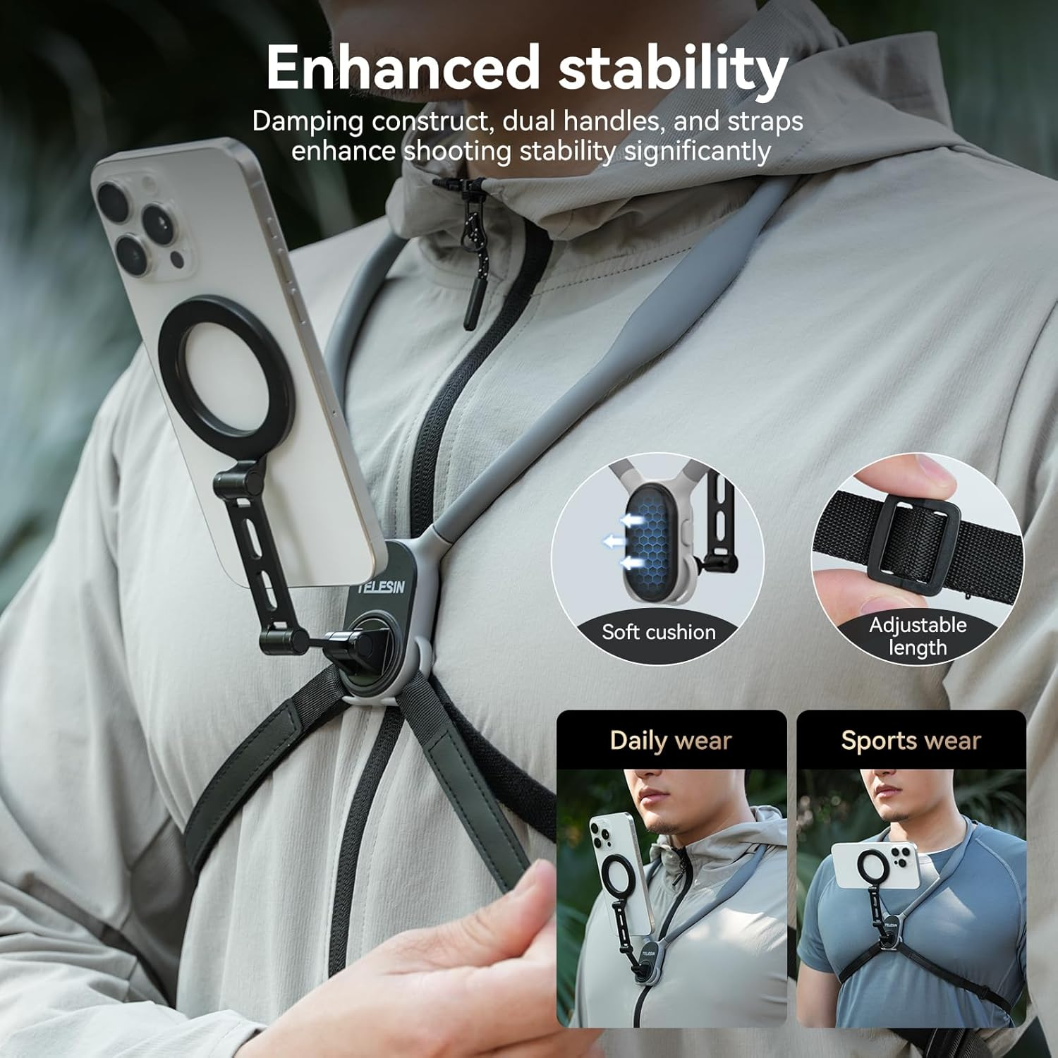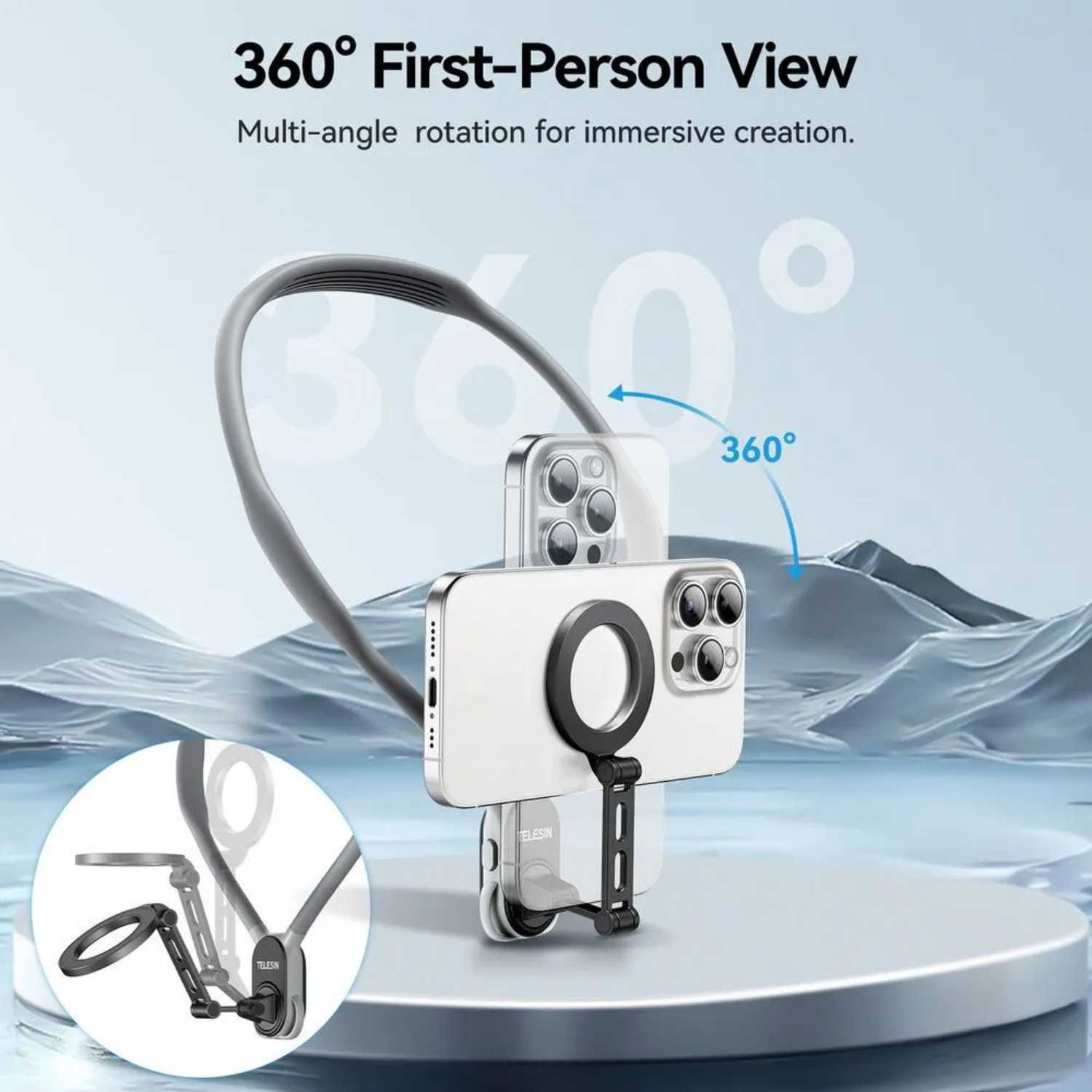هو حامل يُلبس حول الرقبة لتصوير الفيديو بأسلوب POV (منظور الشخص الأول) بدون استخدام اليدين. يعتمد على تثبيت مغناطيسي قوي مع ذراع مرن (Gooseneck) يتيح لك توجيه الهاتف بسهولة والتصوير بزوايا مختلفة أثناء الحركة. المميزات الرئيسية 🎥 تصوير POV احترافي: مثالي للفلوغ، الطبخ، السفر، والمشي. 🧲 تثبيت مغناطيسي سريع (MagSafe): تركيب وفك الهاتف بثواني. 🔄 يدعم التصوير أفقي وعمودي: مناسب TikTok وYouTube. 🦾 ذراع مرن قابل للتشكيل: تضبطه حسب الزاوية اللي تريدها. 🧵 حزام أمان (Safety Strap): حماية إضافية للهاتف. 🧩 متوافق مع كل الأجهزة: iPhone (MagSafe) Android (مع قطعة مغناطيس مرفقة) 🏃♂️ نسخة Max: تجي ويا حزام صدر إضافي لثبات أفضل بالحركة. المواصفات الموديل: MNM-002 / TE-HNB-002 الأبعاد: حوالي 280 × 200 × 170 مم الوزن: حوالي 180 – 220 غرام المواد: سيليكون ستانلس ستيل سبائك معدنية نوع التثبيت: مغناطيسي التوافق: هواتف